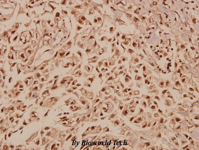 Immunohistochemistry (IHC) analyzes of TFIIA-α (E311) pAb in paraffin-embedded human breast carcinoma tissue at 1:50.