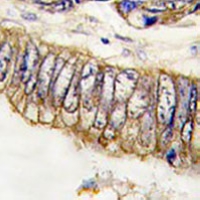 Immunohistochemical analysis of c-Met staining in human colon carcinoma formalin fixed paraffin embedded tissue section. The section was pre-treated using heat mediated antigen retrieval with sodium citrate buffer (pH 6.0). The section was then incubated with the antibody at room temperature and detected using an HRP conjugated compact polymer system. DAB was used as the chromogen. The section was then counterstained with haematoxylin and mounted with DPX.