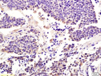 Paraformaldehyde-fixed, paraffin embedded (human lung carcinoma) ; Antigen retrieval by boiling in sodium citrate buffer (pH6) for 15min; Block endogenous peroxidase by 3% hydrogen peroxide for 30 minutes; Blocking buffer (normal goat serum) at 37°C for 20min; Antibody incubation with Integrin alpha 7 Polyclonal Antibody, Unconjugated at 1:200 overnight at 4°C