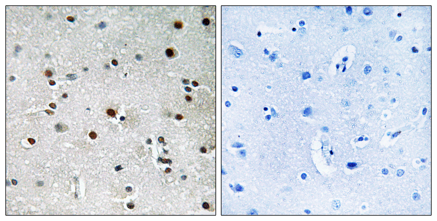 Immunohistochemistry analysis of paraffin-embedded human brain tissue, using RFX3 Antibody. The picture on the right is blocked with the synthesized peptide.