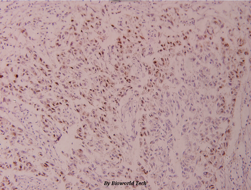 Immunohistochemistry (IHC) analyzes of ATF2 (V65) pAb in paraffin-embedded human breast carcinoma tissue at 1:100.