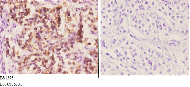 Immunohistochemistry (IHC) analyzes of Daxx (K662) pAb in paraffin-embedded human breast carcinoma tissue at 1:50.showing Cytoplasm and Nuclear staining. Negative control (the right)Using PBS instead of primary antibody, secondary antibody is Goat Anti-Rabbit IgG-biotin followed by avidin-peroxidase.