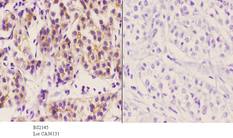Immunohistochemistry (IHC) analyzes of SMIF (S133) pAb in paraffin-embedded human liver carcinoma tissue at 1:50.showing cytoplasmic and nucleus staining. Negative control (the right)Using PBS instead of primary antibody, secondary antibody is Goat Anti-Rabbit IgG-biotin followed by avidin-peroxidase.