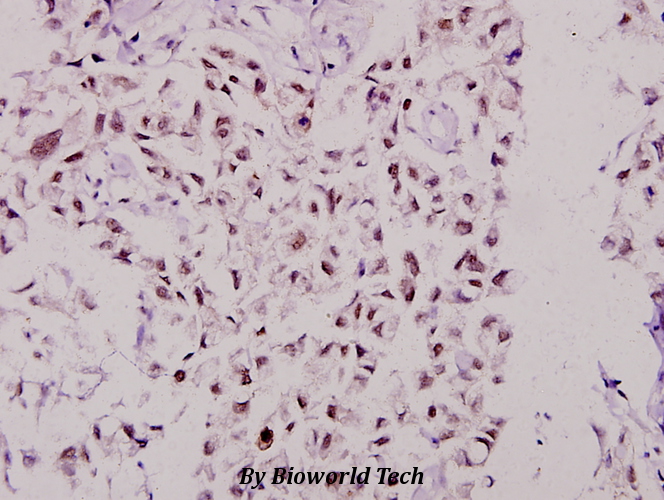 Immunohistochemistry (IHC) analyzes of MSK1 (D205) pAb in paraffin-embedded human breast carcinoma tissue at 1:50.