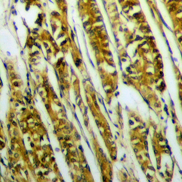 Immunohistochemistry (IHC) analyzes of PTK6 (phospho-Y342) polyclonal antibody in paraffin-embedded human stomach cancer tissue at 1:50.