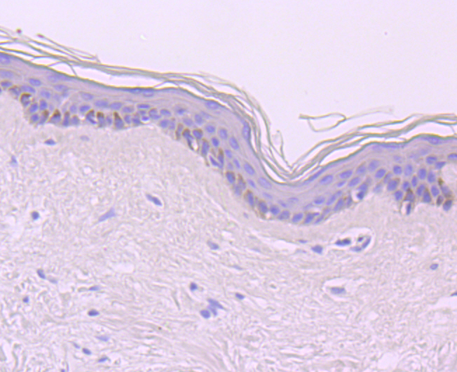 Immunohistochemical analysis of paraffin-embedded human skin tissue using anti-CDT1 antibody. Counter stained with hematoxylin.