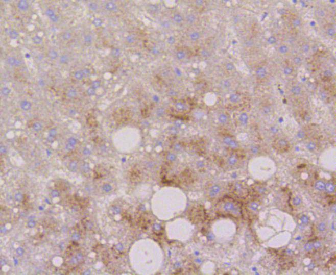 Immunohistochemical analysis of paraffin-embedded human liver tissue using anti-LAMP2a antibody. Counter stained with hematoxylin.