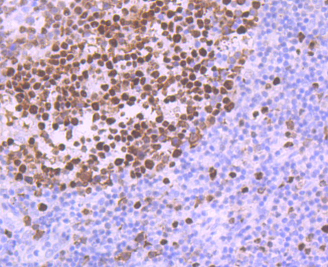 Immunohistochemical analysis of paraffin-embedded human tonsil tissue using anti-MCM5 antibody. Counter stained with hematoxylin.