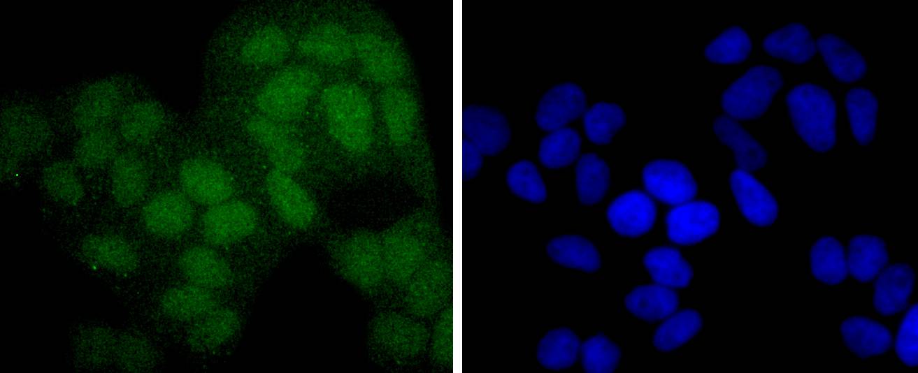 ICC staining PAX5 in Hela cells (green). The nuclear counter stain is DAPI (blue). Cells were fixed in paraformaldehyde, permeabilised with 0.25% Triton X100/PBS.