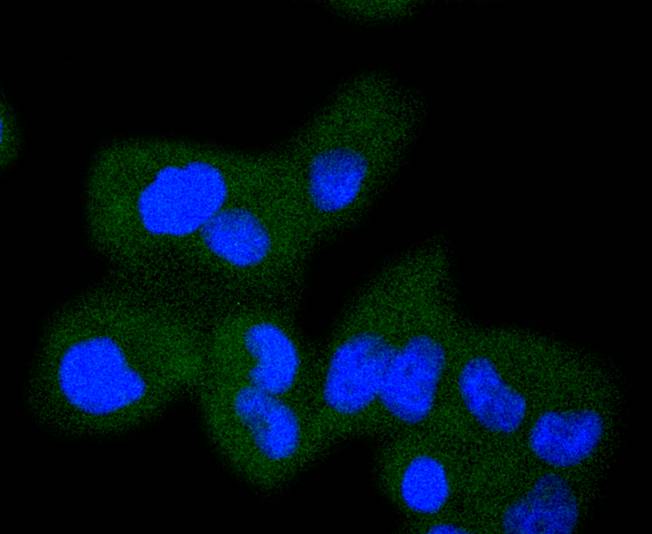 ICC staining Raf1 in Hela cells (green). The nuclear counter stain is DAPI (blue). Cells were fixed in paraformaldehyde, permeabilised with 0.25% Triton X100/PBS.