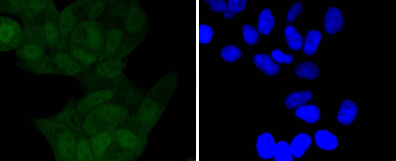 ICC staining Phospho-IKB alpha(S32) in Hela cells (green). The nuclear counter stain is DAPI (blue). Cells were fixed in paraformaldehyde, permeabilised with 0.25% Triton X100/PBS.