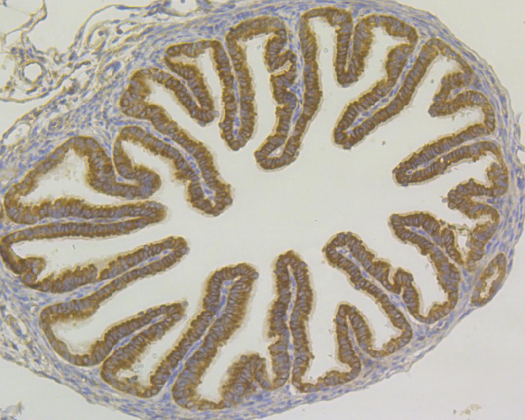 Immunohistochemical analysis of paraffin-embedded mouse fallopian tube tissue using anti-USP9X antibody. Counter stained with hematoxylin. The section was pre-treated using heat mediated antigen retrieval with sodium citrate buffer (pH6) for 20 mins. -