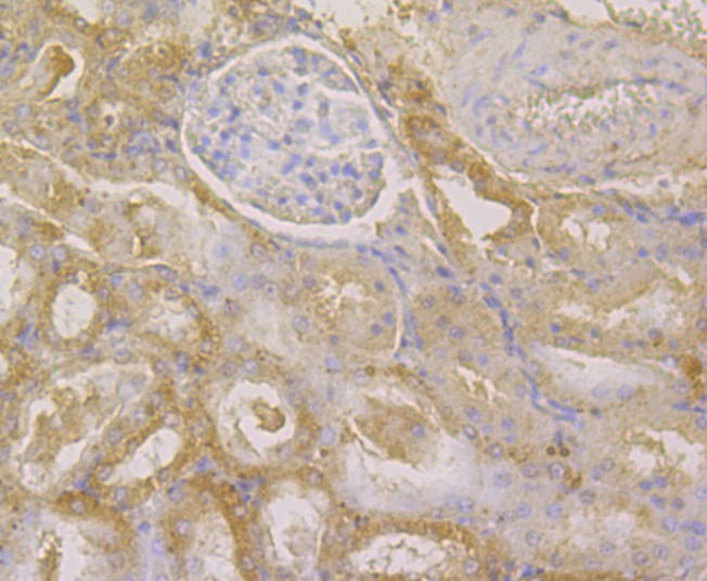 Immunohistochemical analysis of paraffin-embedded rat kidney tissue using anti-GST3 antibody. The section was pre-treated using heat mediated antigen retrieval with Tris-EDTA buffer (pH 8.0-8.4) for 20 minutes.The tissues were blocked in 5% BSA for 30 minutes at room temperature, washed with ddH2O and PBS, and then probed with EM1801-18 at 1/50 dilution, for 30 minutes at room temperature and detected using an HRP conjugated compact polymer system. DAB was used as the chrogen. Counter stained with hematoxylin and mounted with DPX.