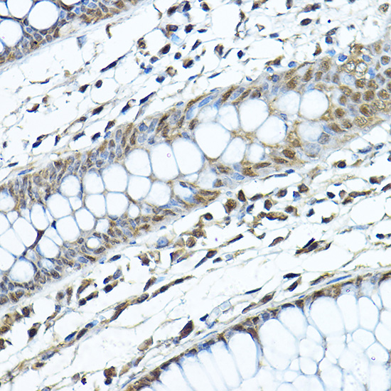 Immunohistochemistry of paraffin-embedded human colon using [KO Validated] SIRT1 Rabbit pAb at dilution of 1:200 .Perform high pressure antigen retrieval with 10 mM citrate buffer pH 6.0 before commencing with IHC staining protocol.