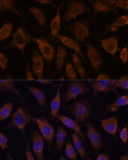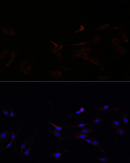 Immunofluorescence analysis of C6 cells using SUCLG1 antibody at dilution of 1:100. Blue: DAPI for nuclear staining.